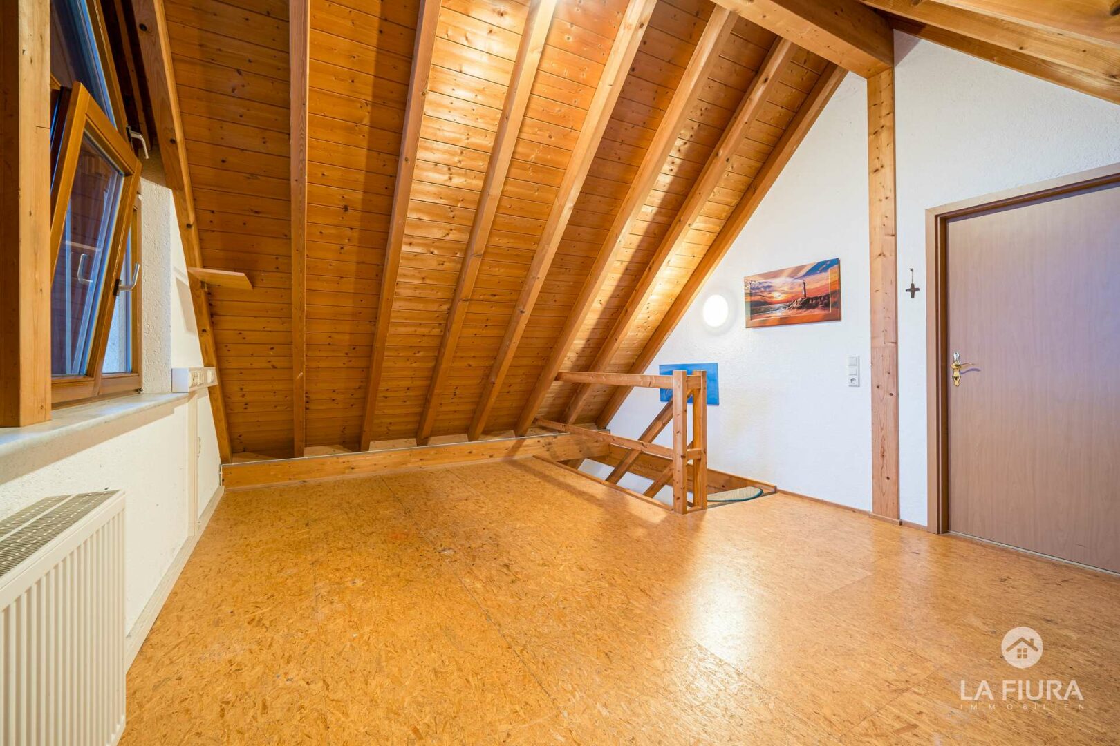 Von hier aus gelangen Sie per Holztreppe in ein ausgebautes Studio unter dem Dach, das weitere Wohnfläche bietet. Die vorhandenen ca. 29 qm sind denkbar für eine Nutzung als Elternschlafzimmer, es lässt sich jedoch auch für Hobby und Freizeit oder Gäste nutzen. Auch ein Kind hätte sicherlich Freude am besonderen Wohngefühl unter dem Dach.