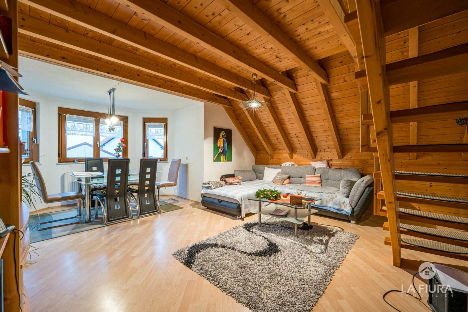 Die Räumlichkeiten verfügen über ein gepflegtes Erscheinungsbild und nicht nur die sichtbare Holzdecke oder ein Erker mit Balkonzugang vermitteln ein besonderes und gemütliches Wohngefühl.