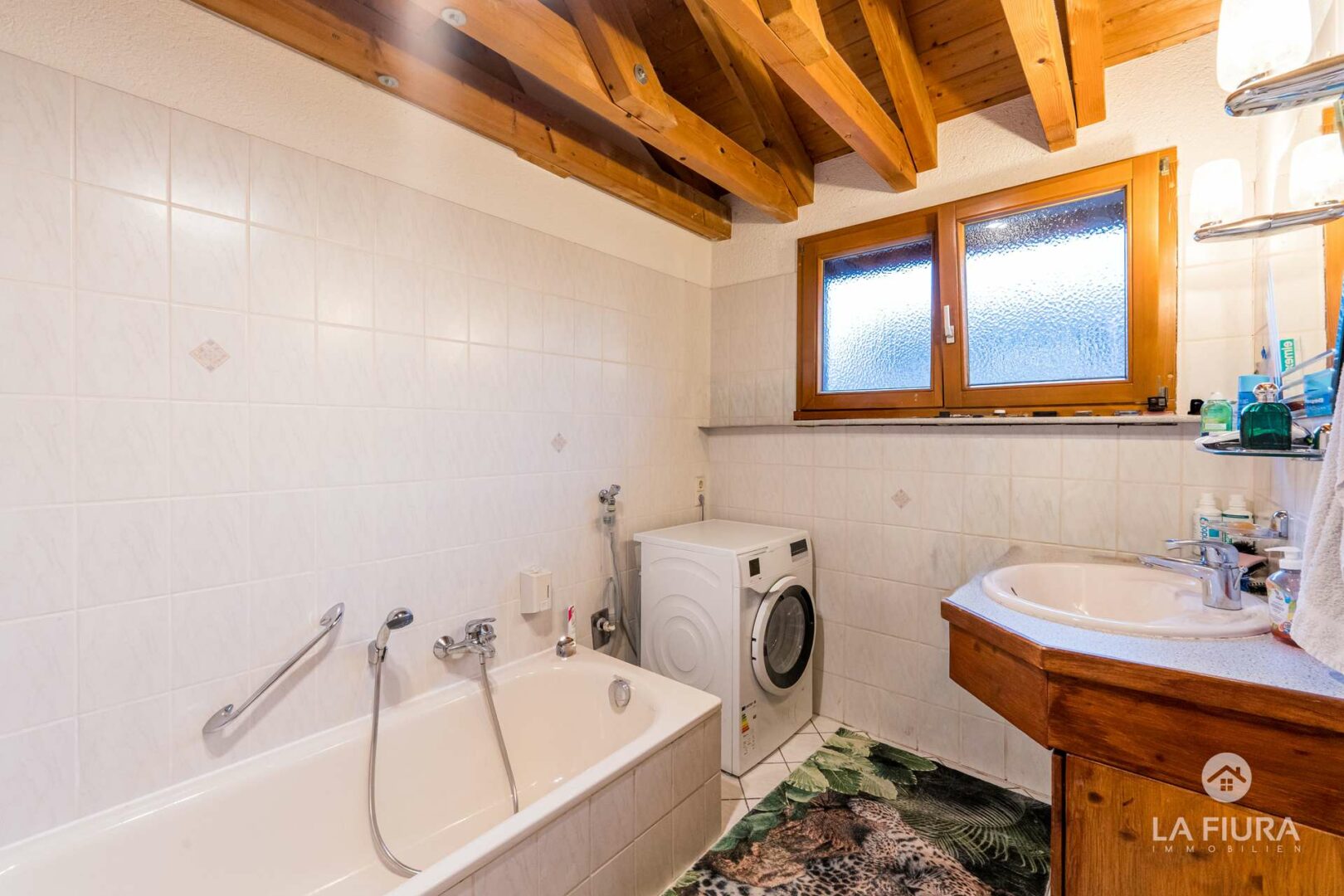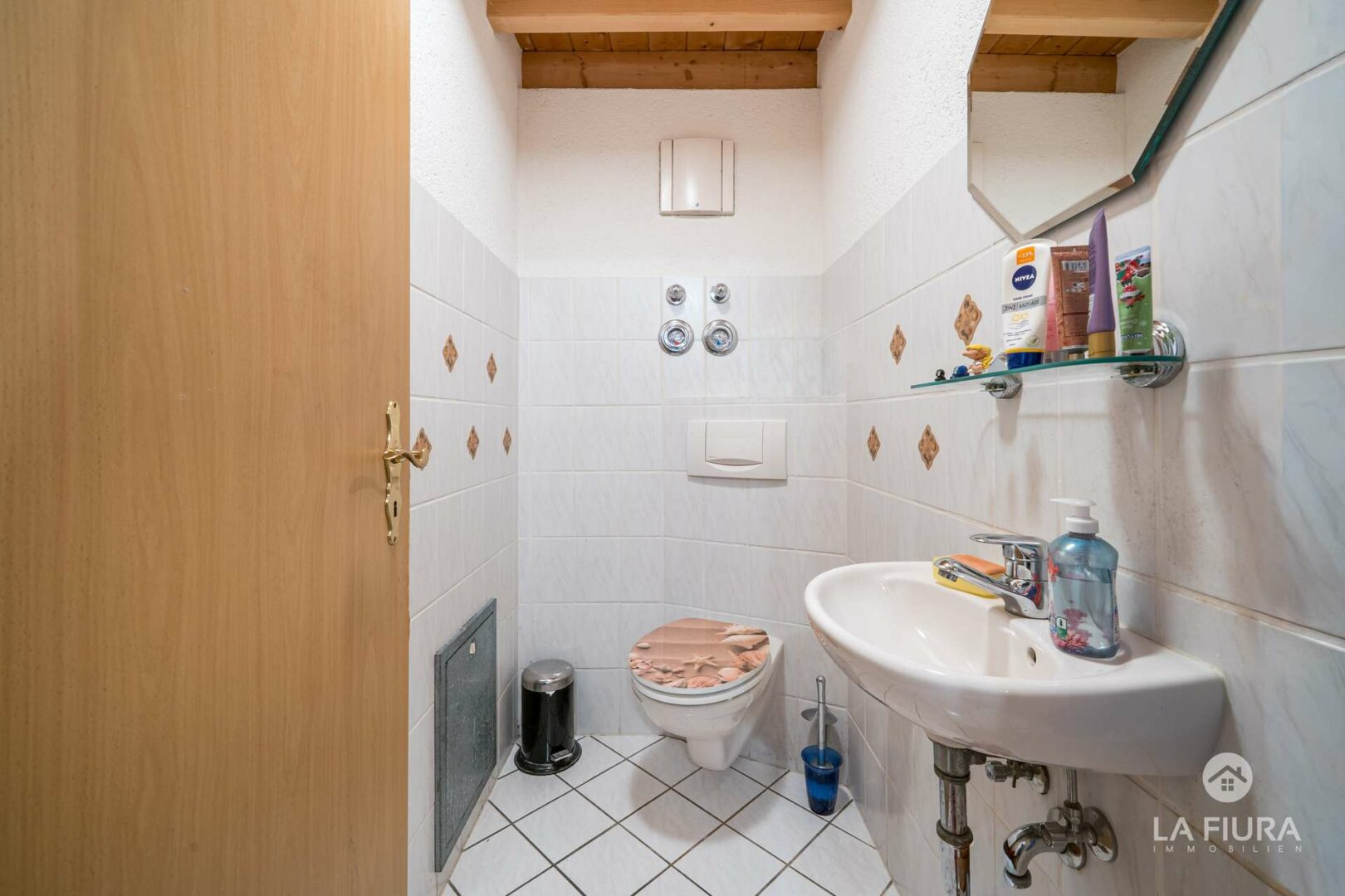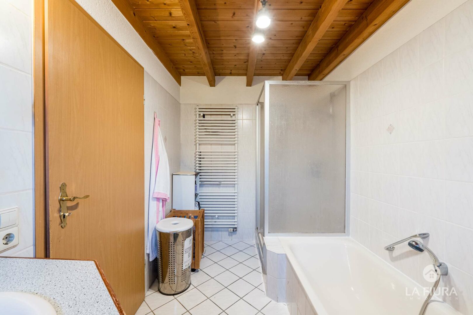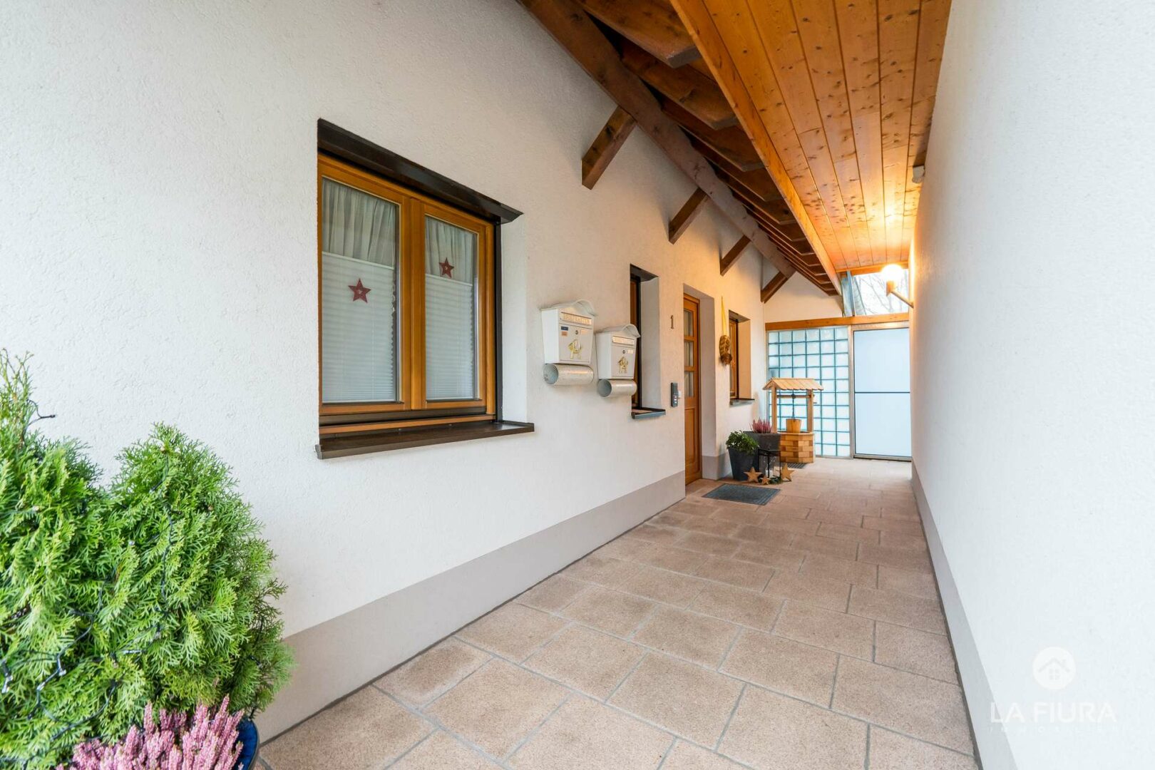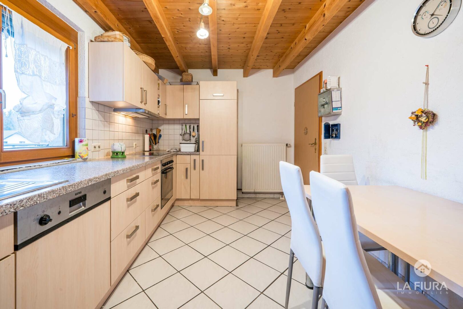 Sie betreten die Wohnung über einen kleinen Flur, der Platz für Ankleide und Garderobenschrank bietet. Der Flur ist mit einem pflegeleichten Fliesenboden versehen, die Wände sind verputzt und die Decke präsentiert sich als offene Holzdecke mit schönen Sichtbalken.