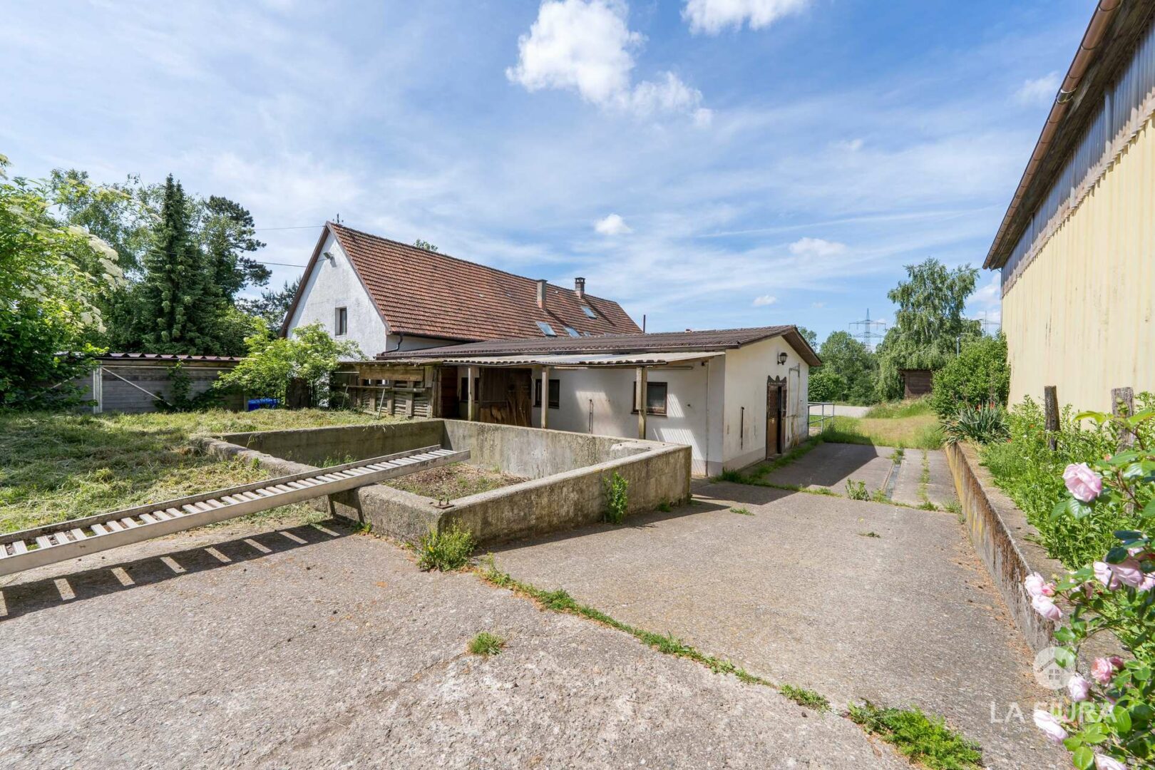 Ein Bauernhaus mit aktuell zwei Wohneinheiten bietet die Möglichkeit den Pferdehof selbst zu bewohnen und darüber hinaus Zimmer für Personal oder Feriengäste zu bieten. Das Gebäude ist sowohl teilweise bezugsfähig, als auch sanierungsbedürftig. Praktisch sind die angrenzende Scheune sowie ein Stall, in dem Sie z. B. Pferdezucht betreiben können.