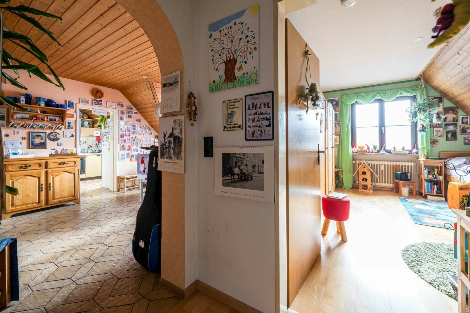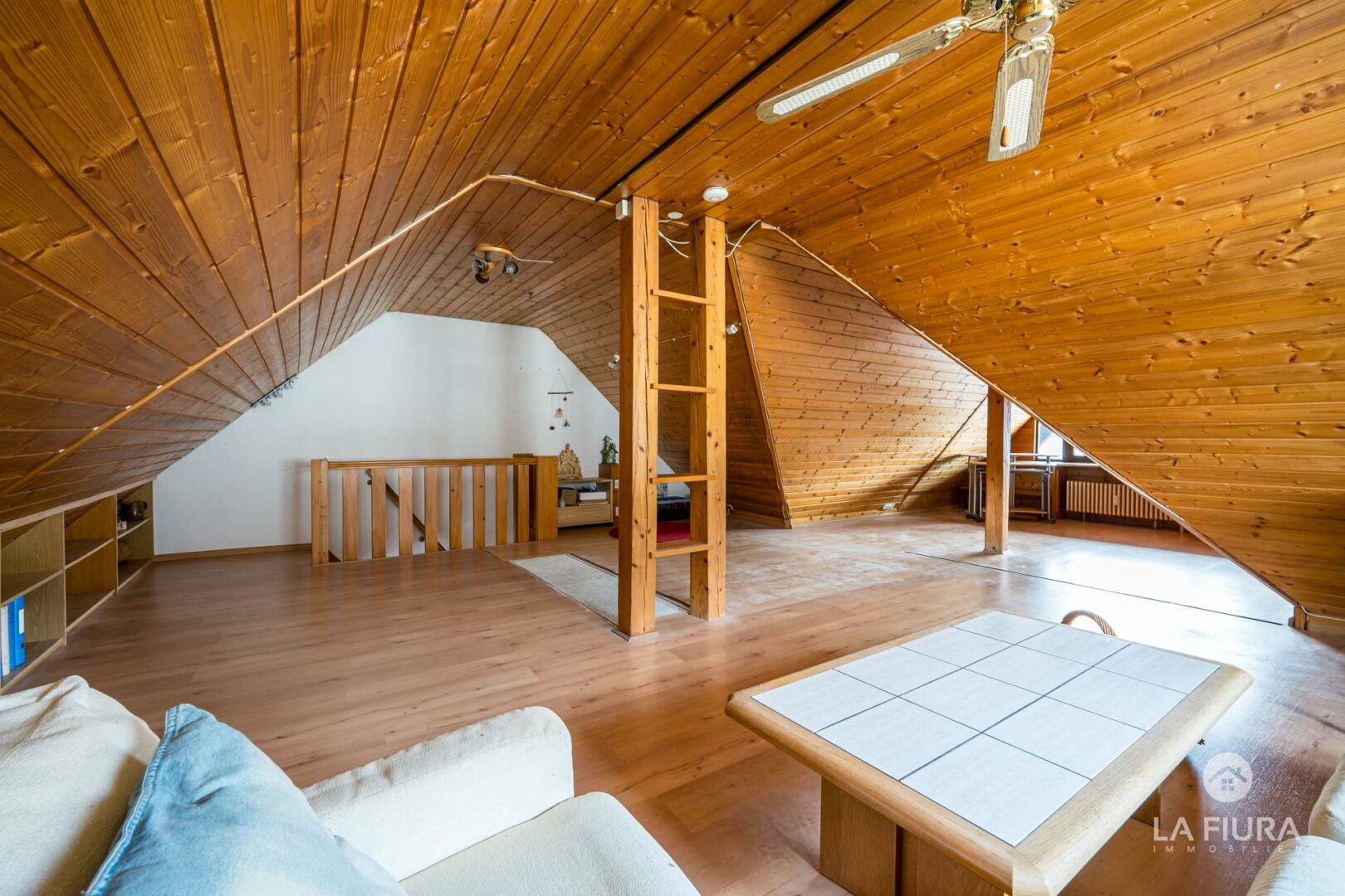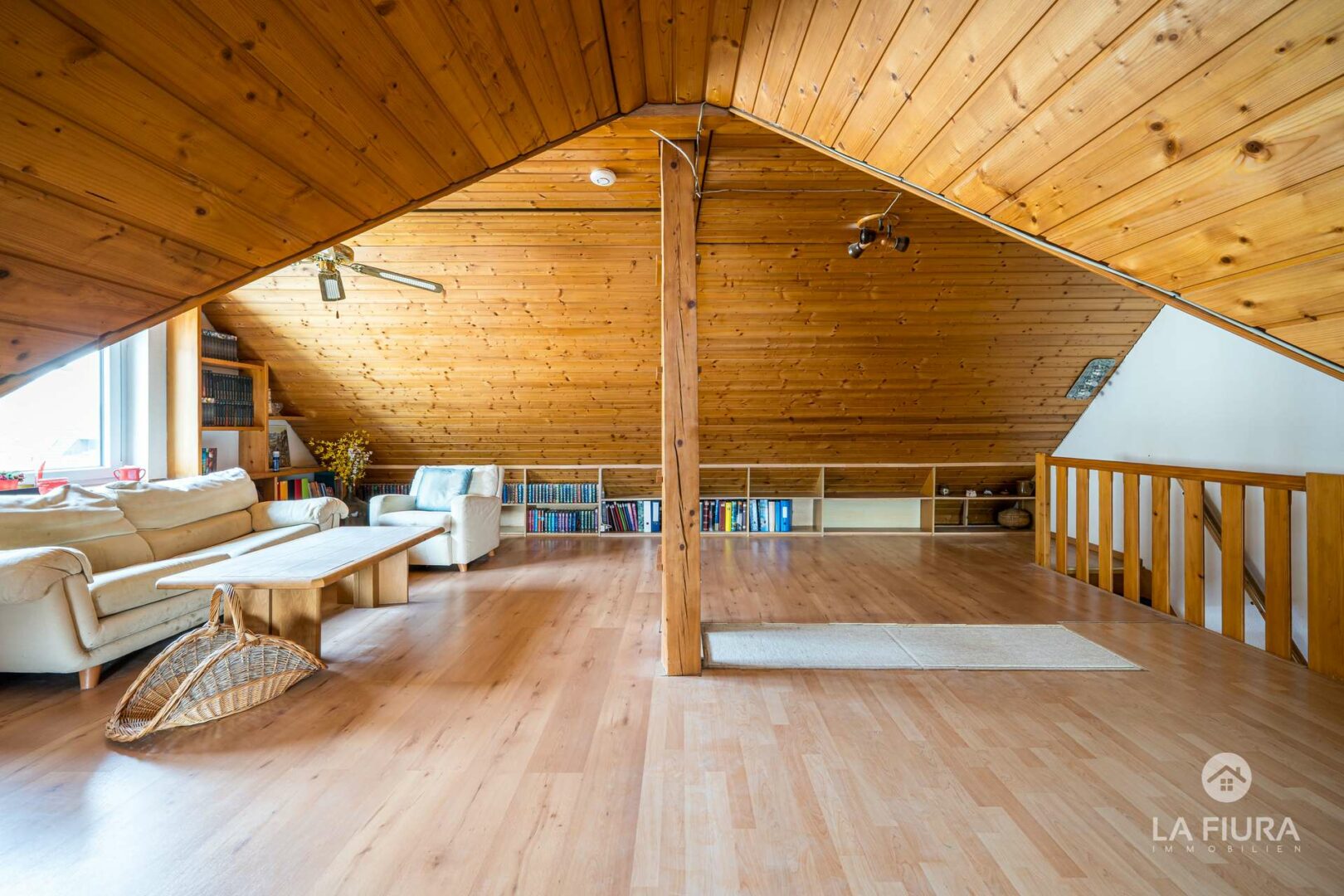 Betritt man die Wohnung, gelangt man rasch in einen ca. 34 qm großen Wohnbereich, der Behaglichkeit und ein besonderes Flair vermittelt. Dieser Wohnraum wird auf der Süd- und Nordseite von jeweils einem Balkon flankiert, wodurch zu jeder Tageszeit angenehmes Licht und eine natürliche Durchlüftung gewährleistet sind. Von hier aus führt eine Treppe in das großflächige Dachstudio, das sich ideal als zweites Wohnzimmer, als großzügiger Elternbereich, Atelier oder Homeoffice nutzen lässt und der Wohnung eine besondere architektonische Note verleiht.