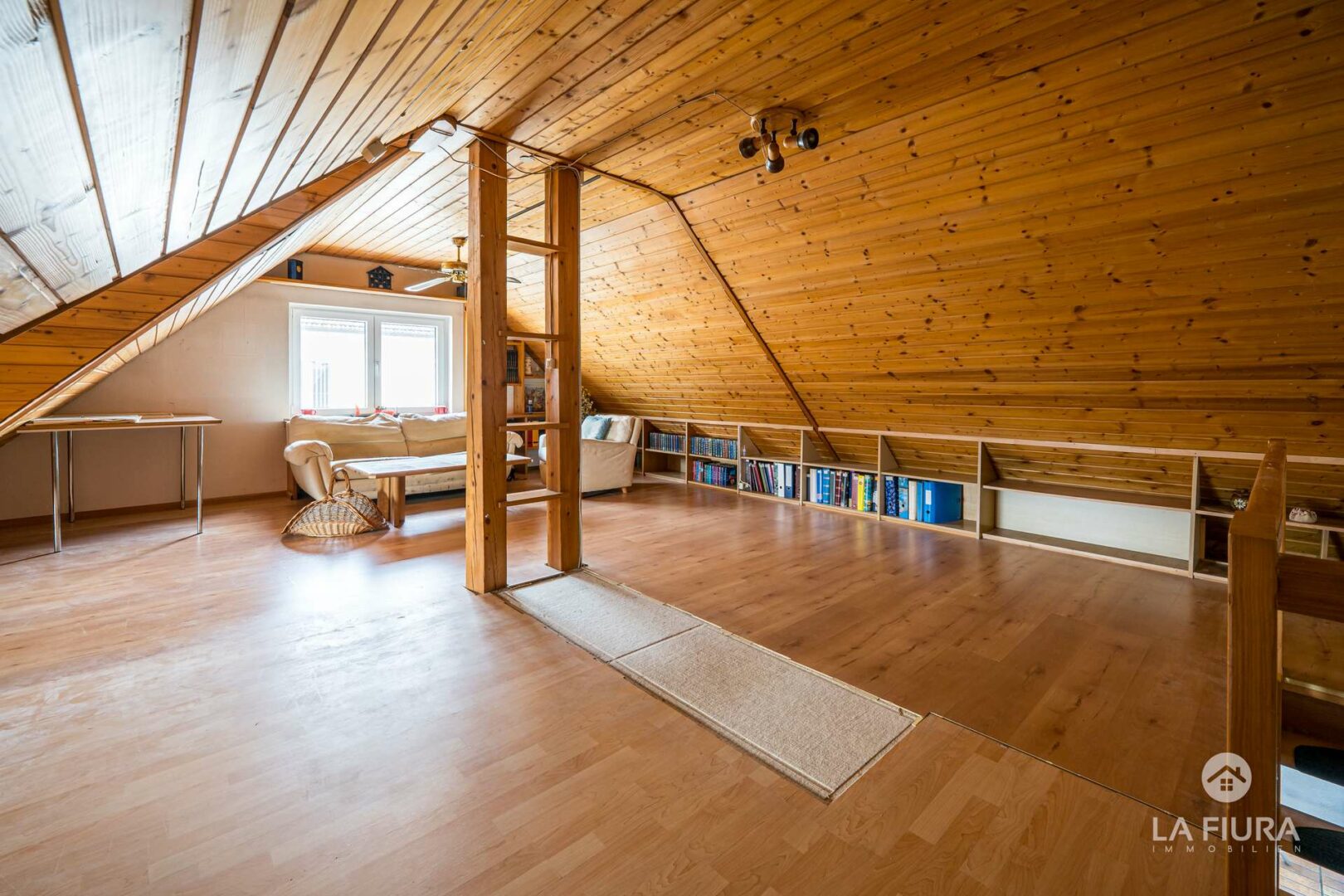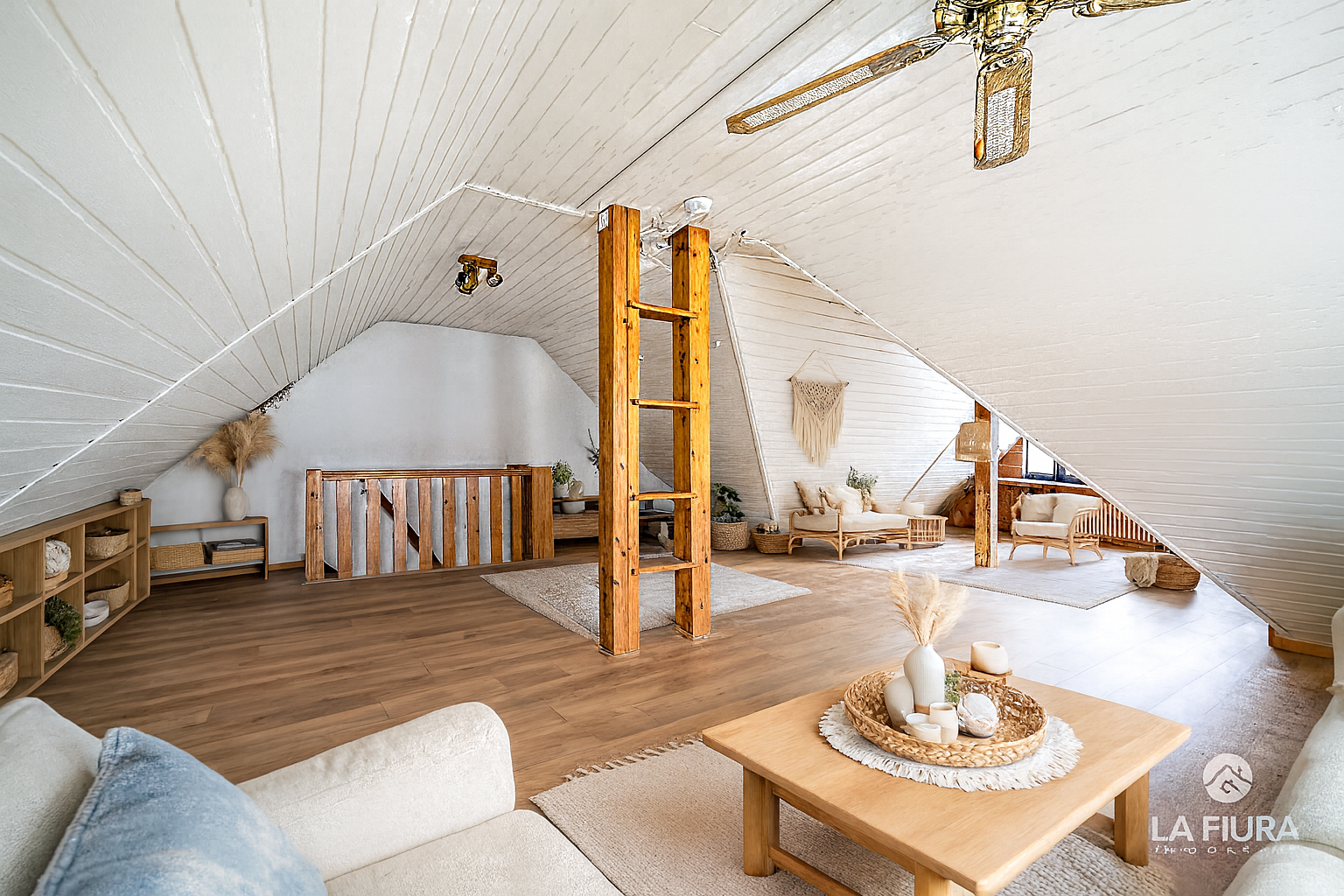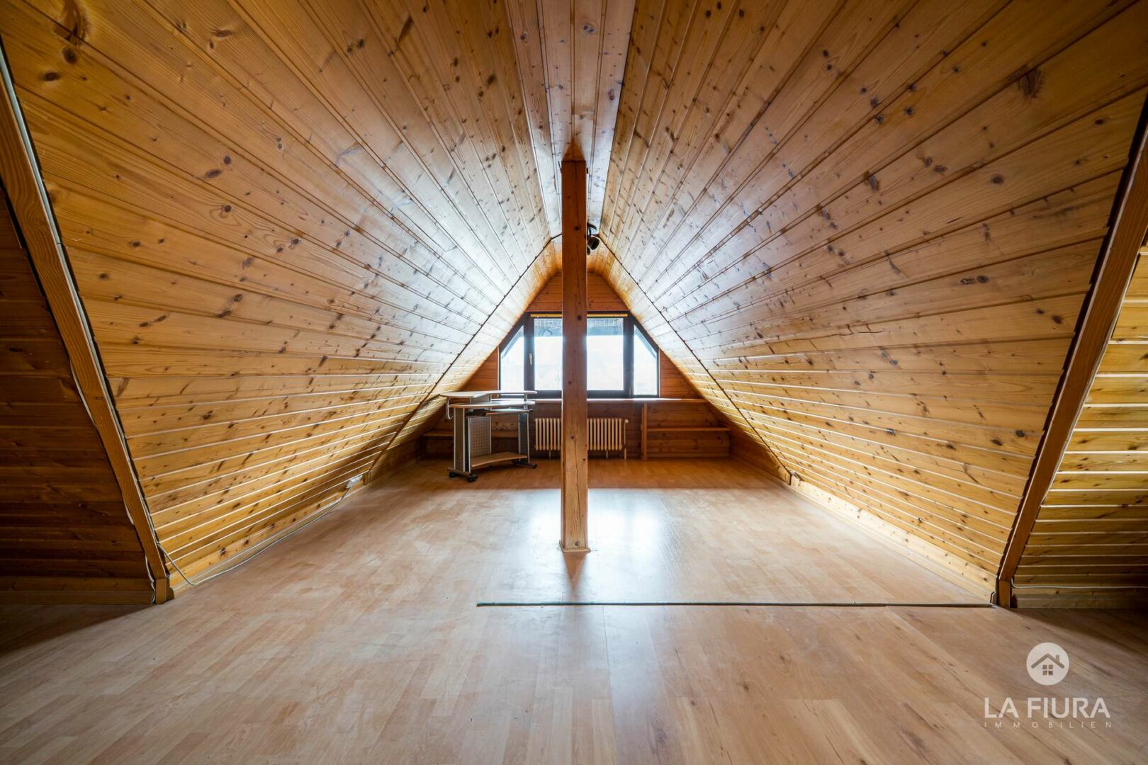 Betritt man die Wohnung, gelangt man rasch in einen ca. 34 qm großen Wohnbereich, der Behaglichkeit und ein besonderes Flair vermittelt. Dieser Wohnraum wird auf der Süd- und Nordseite von jeweils einem Balkon flankiert, wodurch zu jeder Tageszeit angenehmes Licht und eine natürliche Durchlüftung gewährleistet sind. Von hier aus führt eine Treppe in das großflächige Dachstudio, das sich ideal als zweites Wohnzimmer, als großzügiger Elternbereich, Atelier oder Homeoffice nutzen lässt und der Wohnung eine besondere architektonische Note verleiht.