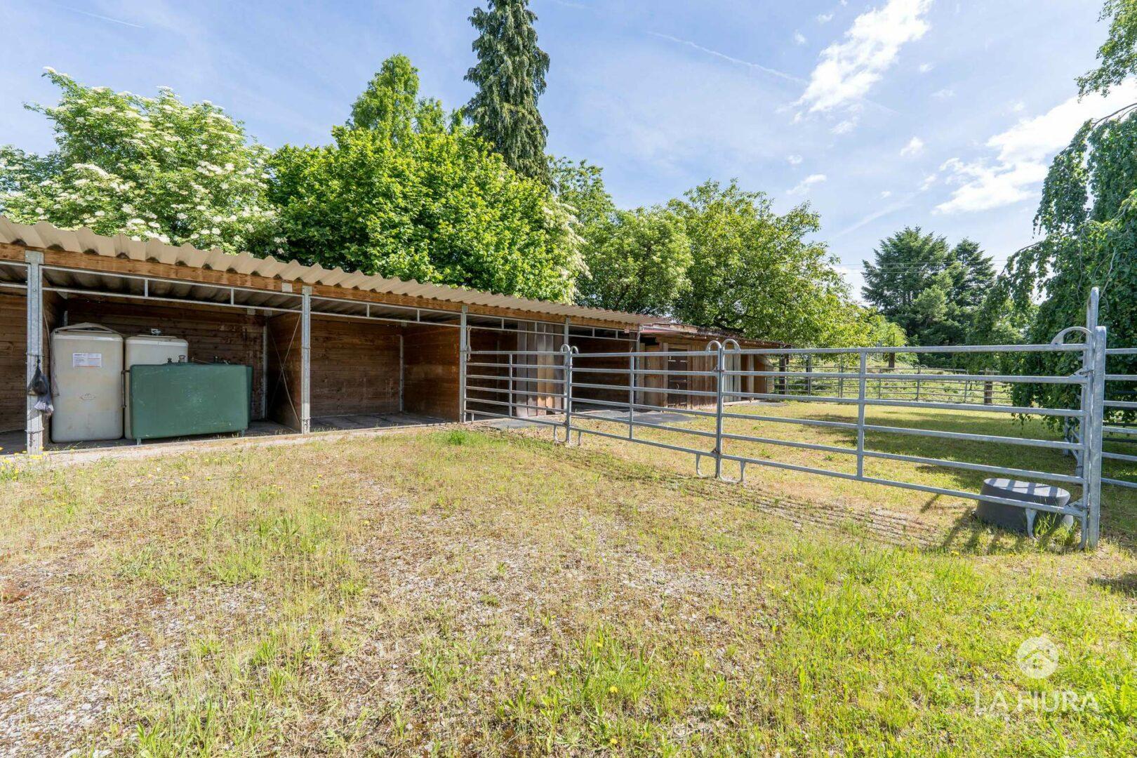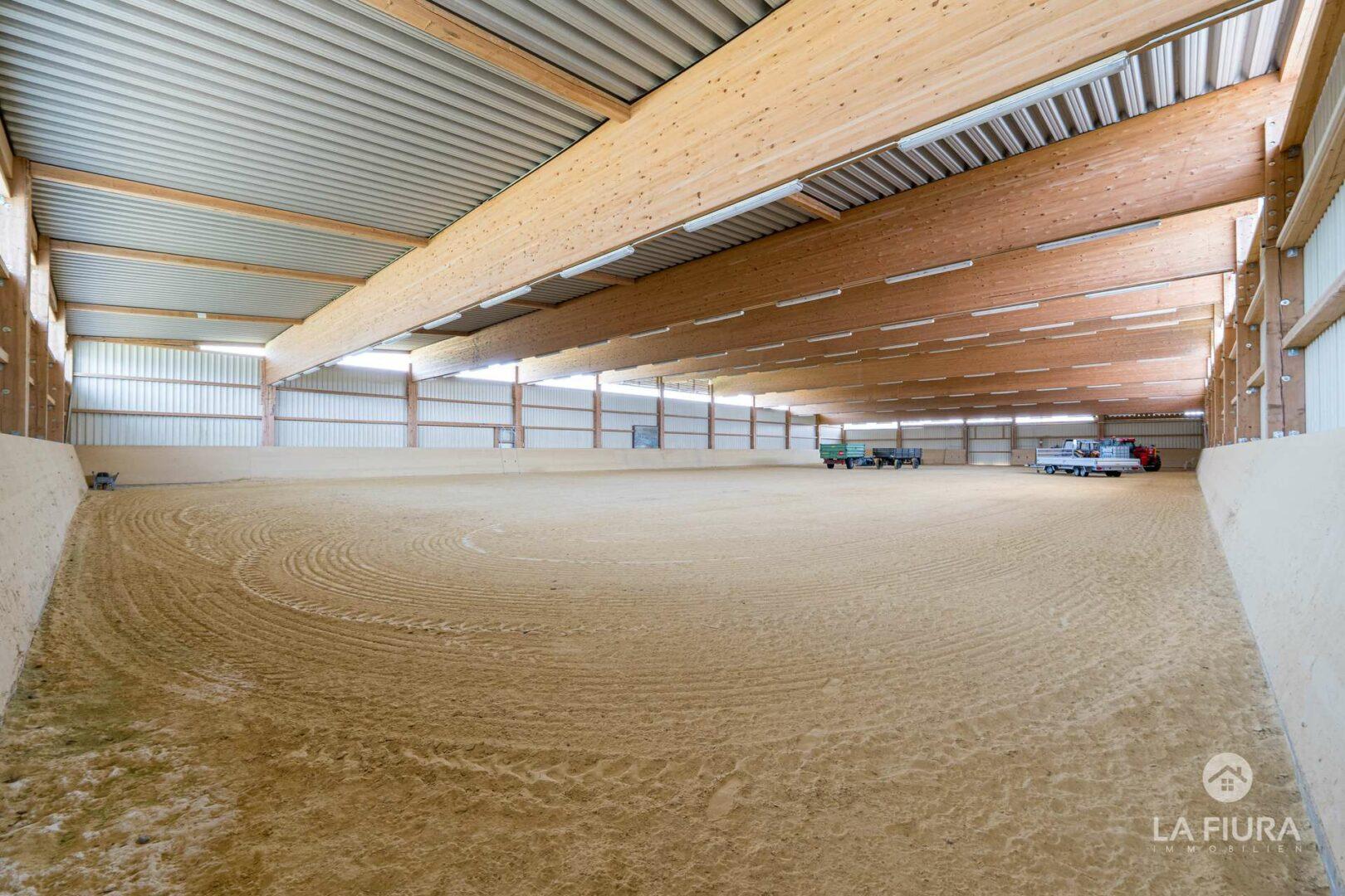 In einer ca. 50 Jahre alte Lagerhalle mit elektrischem Tor befindet sich ein Roundpen mit Hackschnitzeln sowie das Heulager des Hofs. An verschiedenen Standorten befinden sich zahlreiche Pferdeboxen für ca. 30-40 Pferde. Nutzen Sie bereits genehmigte Baupläne für weitere Boxen, sodass Sie die Anzahl der Pferde auf dem Hof um ca. 25 Tiere erweitern und somit die Ertragsmöglichkeiten steigern können.